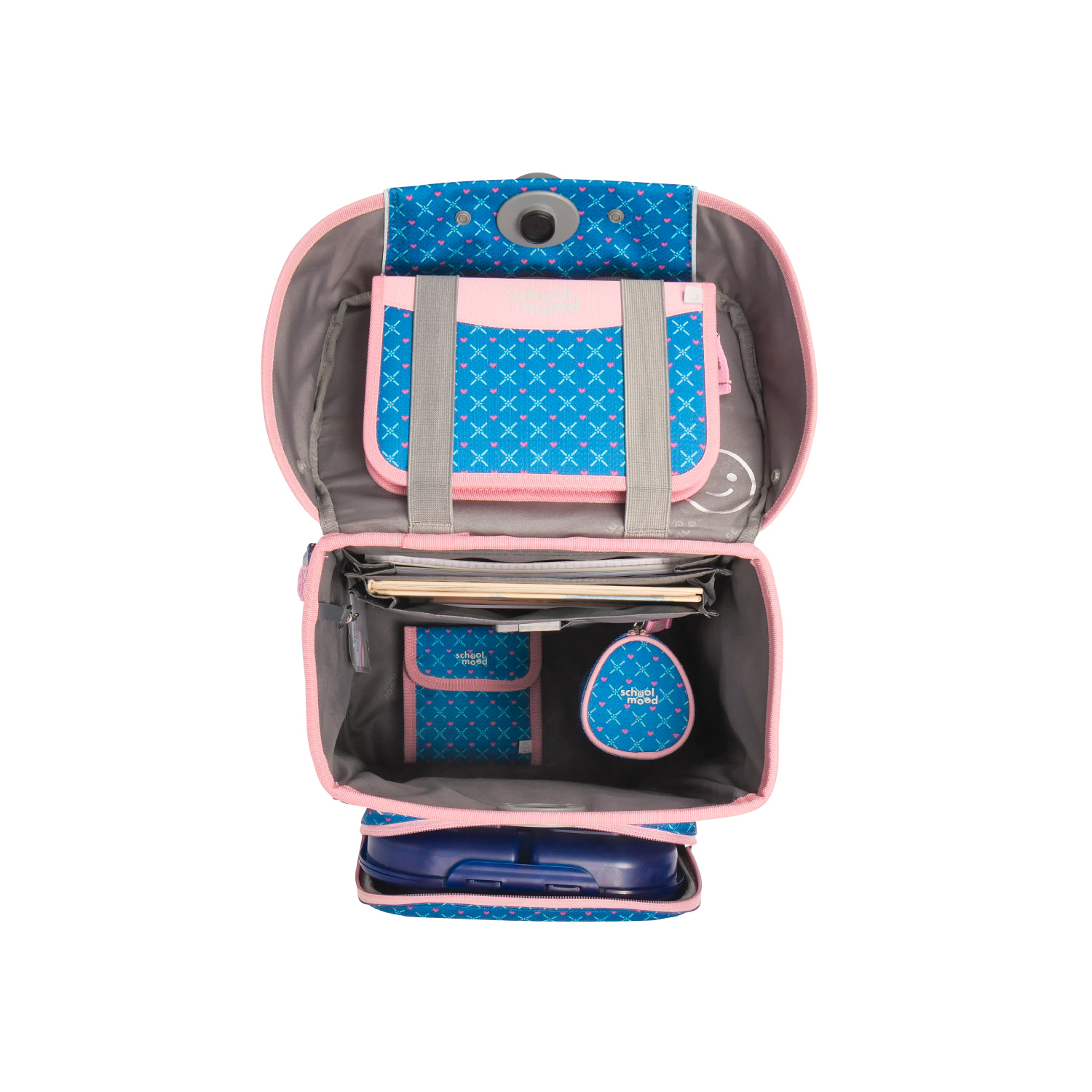 Der Champion ist ein wahrer Alleskönner. Platzangebot, Alltagstauglichkeit und Ergonomie - hier passt einfach alles. Das 7-teiliges Set enthält Ranzen, Turnbeutel, Etui (21-tlg., Markenfüllung von Eberhard Faber), Schlamperrolle, Brotdose, 3-tlg. Patchy-Set und einen Plüschanhänger "Moodie".