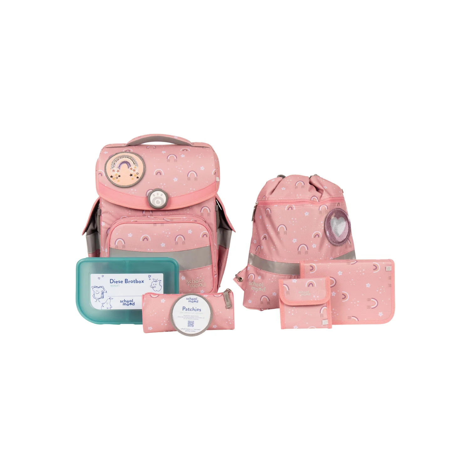 Mit dem 7-teiligen Set, bestehend aus Ranzen, Turnbeutel, gefülltem Etui, Schlamperrolle, Brustbeutel, Brotdose und Patchy-Set seid ihr bestens ausgestattet für den Schulalltag.