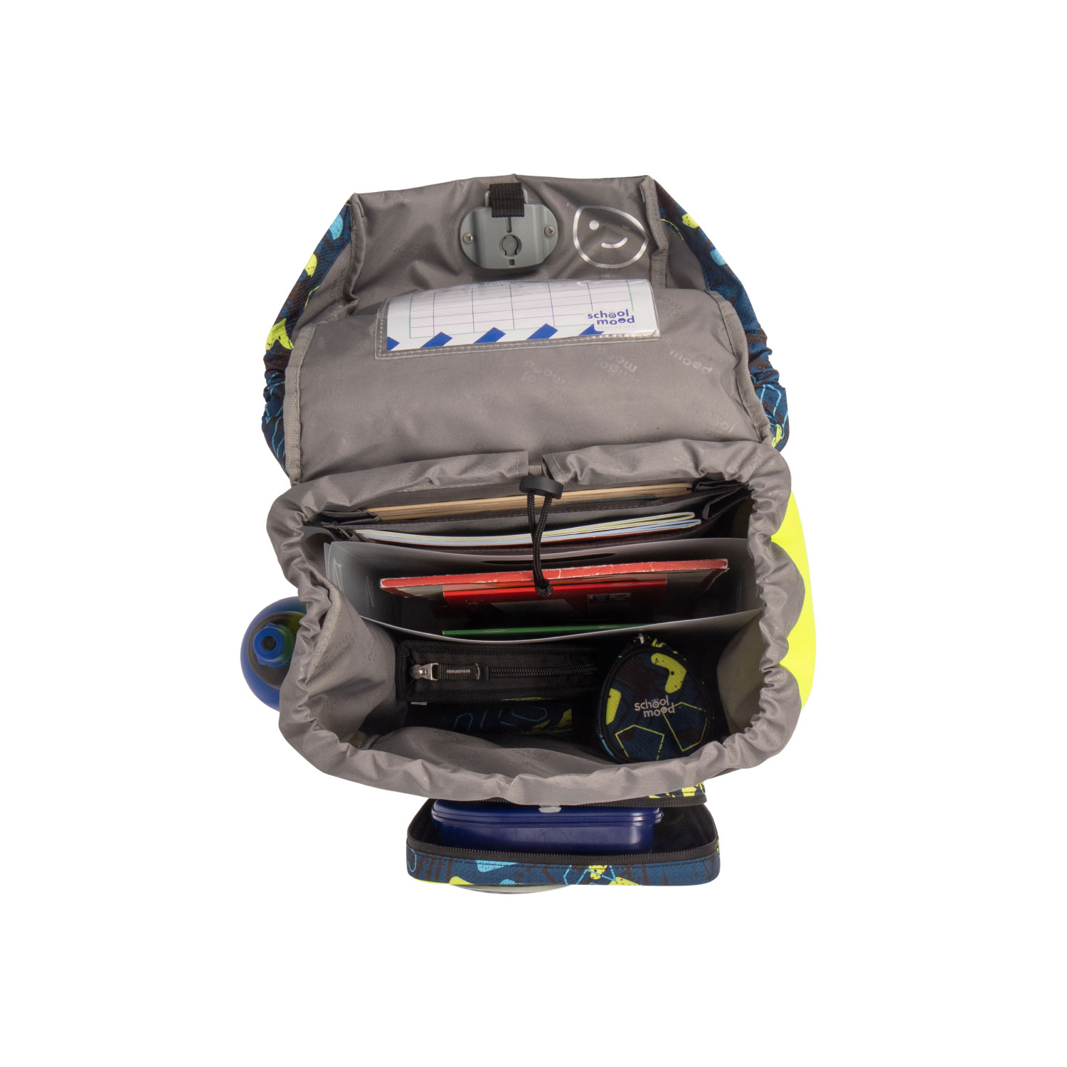 Der Rebel kombiniert die Coolness eines Softbags mit den ergonomischen Trageeigenschaften einer bis ins kleinste Detail durchdachten Schultasche. Leicht, geräumig und standfest dank fester Bodenplatte bietet er Platz für alle Schulutensilien. Damit Hefte und andere Arbeitsmaterialien vor Eselsohren sicher sind, ist in diesem Set zusätzlich eine Heftbox enthalten. Das 8-teilige Set enthält Ranzen, Turnbeutel, Etui (21-tlg., Markenfüllung von Eberhard Faber), Schlamperrolle, Brustbeutel, Brotdose, Patchy-Set (3-tlg.) und Heftbox.