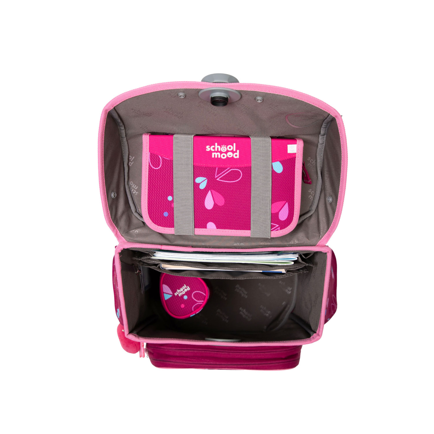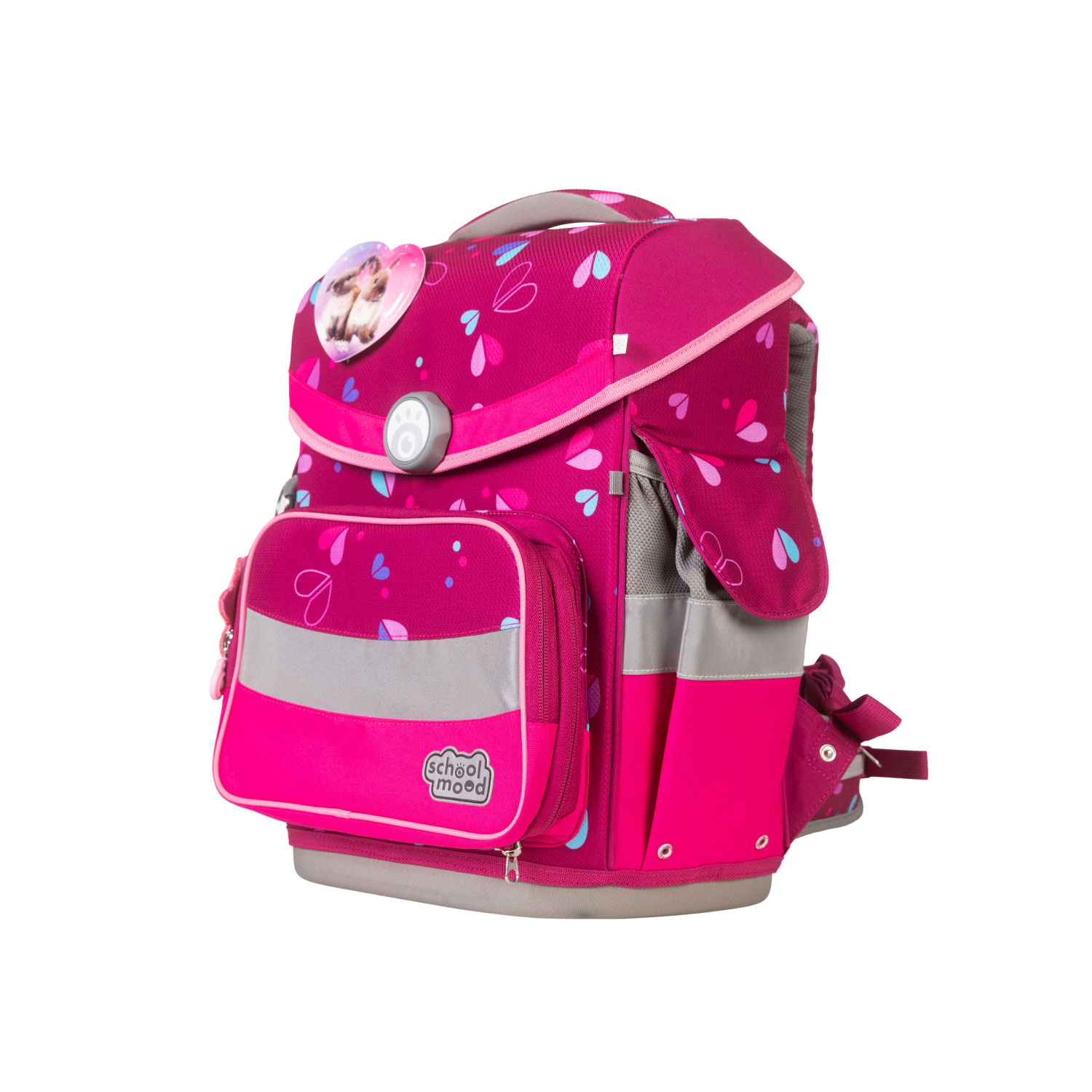 Der Schulranzen Timeless in klassischer Ranzenform bietet ein enormes Platzangebot und ist gleichzeitig super leicht und angenehm zu tragen. Ein geräumiges Hauptfach, Fronttasche und große Seitentaschen sorgen für Ordnung und kinderleichtes Handling. Das 7-teilige Set enthält Ranzen, Turnbeutel, Etui (21-tlg., Markenfüllung von Eberhard Faber), Schlamperrolle, Brotdose, 3-tlg. Patchy-Set und einen Plüschanhänger "Moodie".