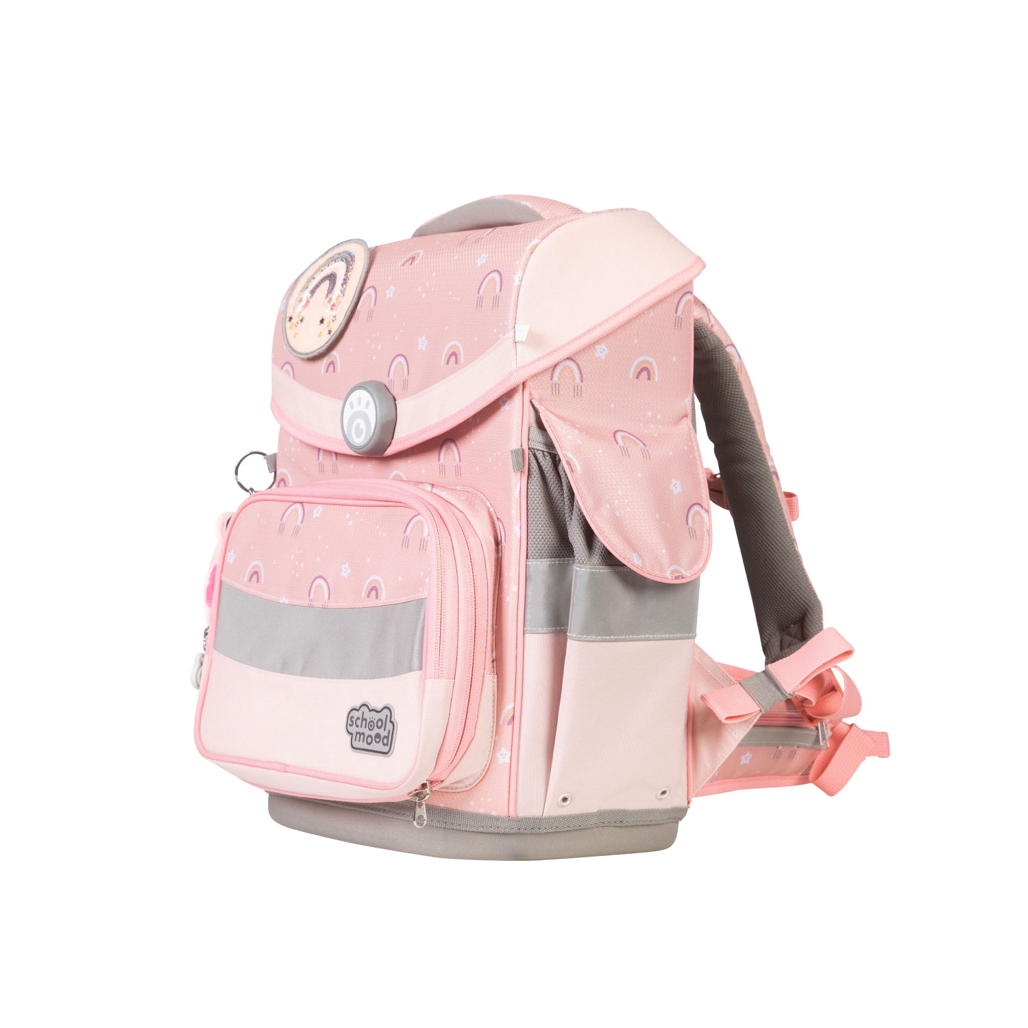 Der Schulranzen Timeless in klassischer Ranzenform bietet ein enormes Platzangebot und ist gleichzeitig super leicht und angenehm zu tragen. Ein geräumiges Hauptfach, Fronttasche und große Seitentaschen sorgen für Ordnung und kinderleichtes Handling. Das 7-teilige Set enthält Ranzen, Turnbeutel, Etui (21-tlg., Markenfüllung von Eberhard Faber), Schlamperrolle, Brotdose, 3-tlg. Patchy-Set und einen Plüschanhänger "Moodie".